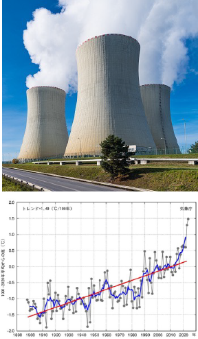 地球温暖化や沸騰は、物質の燃焼時に排出される温室効果ガスCO2が主原因と考えられてきました。しかし、現在の大気中のCO2濃度は0.04%であり、たとえこの濃度が2倍3倍になったとしても、地球の気候に大きな変化をもたらすという物理的な根拠や論理は十分には確立されていません。一方、大気の約50%以上は水蒸気(湿気・湿度)で、その主成分はH2Oです。火力発電は、燃料源を問わず、膨大な量の水蒸気を発生します。単純計算で、1kWhの電力を発電するために約10リットルの水を蒸気ガスに変える必要があります。水は蒸気になると体積が約1,700倍に膨張します。気温が1℃上昇すると、空気が含むことができる水蒸気の最大量(飽和水蒸気量)が約7%増加することが明らかになっています。世界中の火力発電所から長年にわたり放出されてきた水蒸気量を考慮すると、単純な物理現象の結果として、水蒸気による気圧の上昇と気温の上昇が連鎖反応を起こし、地球温暖化を相乗的に加速させ、沸騰へと移行していると言えます。